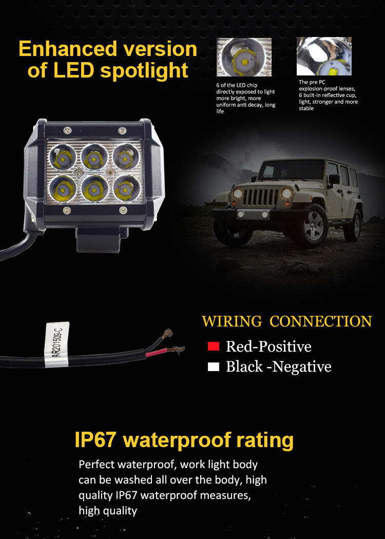 إن مصباح ليي لي ياف LED عالي السطوع بقوة 18 واط ومكوَّن من 6 صمامات ضوئية ثنائية (LED) وبتصنيف مقاومة الغبار والماء IP67 هو حل إضاءةٍ موثوقٌ وقويٌ مُصمَّم خصيصًا للمركبات المستخدمة في الطرق الوعرة والمركبات العاملة. وتُعد هذه الشريحة الإضاءة LED مثالية لأي شخص يحتاج إلى إضاءةٍ قويةٍ وواضحةٍ في الظروف الخارجية القاسية. سواء كنت تقود على طرقات وعرة، أو تعمل ليلًا، أو تحتاج إلى إضاءة إضافية لشاحنتك أو دراجتك الرباعية الآلية (ATV)، فإن هذه الشريحة الإضاءة مبنية لتوفير أداءٍ قويٍ جدًّا.
